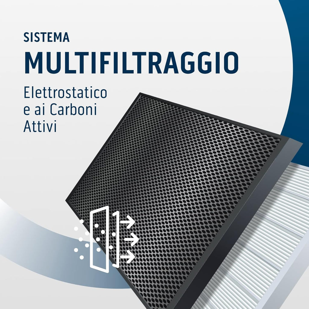Sistema multi-filtraggio composto da filtro elettrostatico (con funzione anti-polvere) e filtro a carboni attivi (efficace contro i cattivi odori).