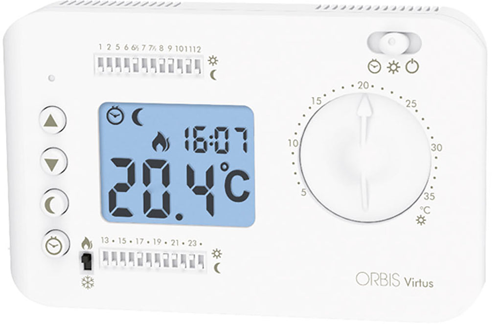 VIRTUS Cronotermostato digitale da parete, programmazione giornaliera con cavalieri, colore BIANCO, alim. 2 batterie 1,5V – ORBIS