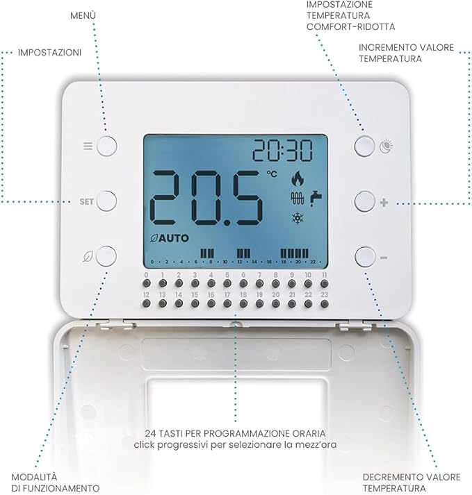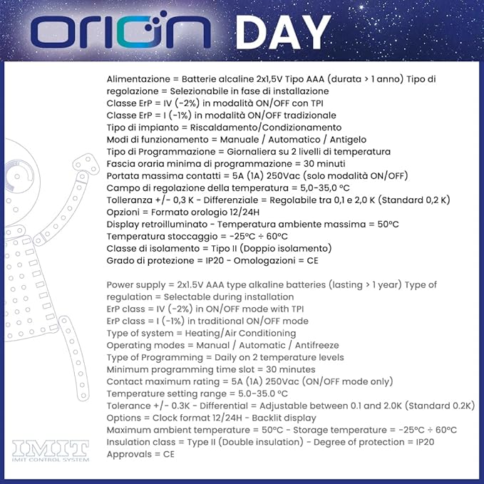 ORION DAY è un cronotermostato giornaliero digitale. Grazie alla logica di funzionamento TPI, sfrutta l’inerzia termica di ogni tipo di ambiente, garantendo comfort assoluto, risparmio energetico ed economico e un contributo ErP IV fino al 2%. Unisce la semplicità di programmazione al risparmio energetico, con 2 temperature impostabili a passi di 30 minuti. Grazie al grande display LCD retroilluminato è possibile visualizzare temperatura rilevata, ora o temperatura impostata, e modalità di funzionamento: Auto (Comfort-Eco)/Manuale/Antigelo (Off). I 24 micropulsanti orari e gli altri controlli sono facilmente accessibili, ma protetti da una cover pulita che lo rende adatto a qualsiasi ambiente di installazione. È ideale per chi ha abitudini differenti a seconda dell’ora del giorno o ha ambienti che sfrutta in momenti diversi della giornata. DICHIARAZIONE DI CONFORMITÀ Regolamento sulla compatibilità elettromagnetica 2014/30/UE (EN 61000-6-3: 2021, EN 61000-6-1: 2019) Direttiva sulla bassa tensione 2014/35/EU (EN IEC 60730-2-9:2019/A2:2020, IEC 60730-1:2013/AMD2:2020)