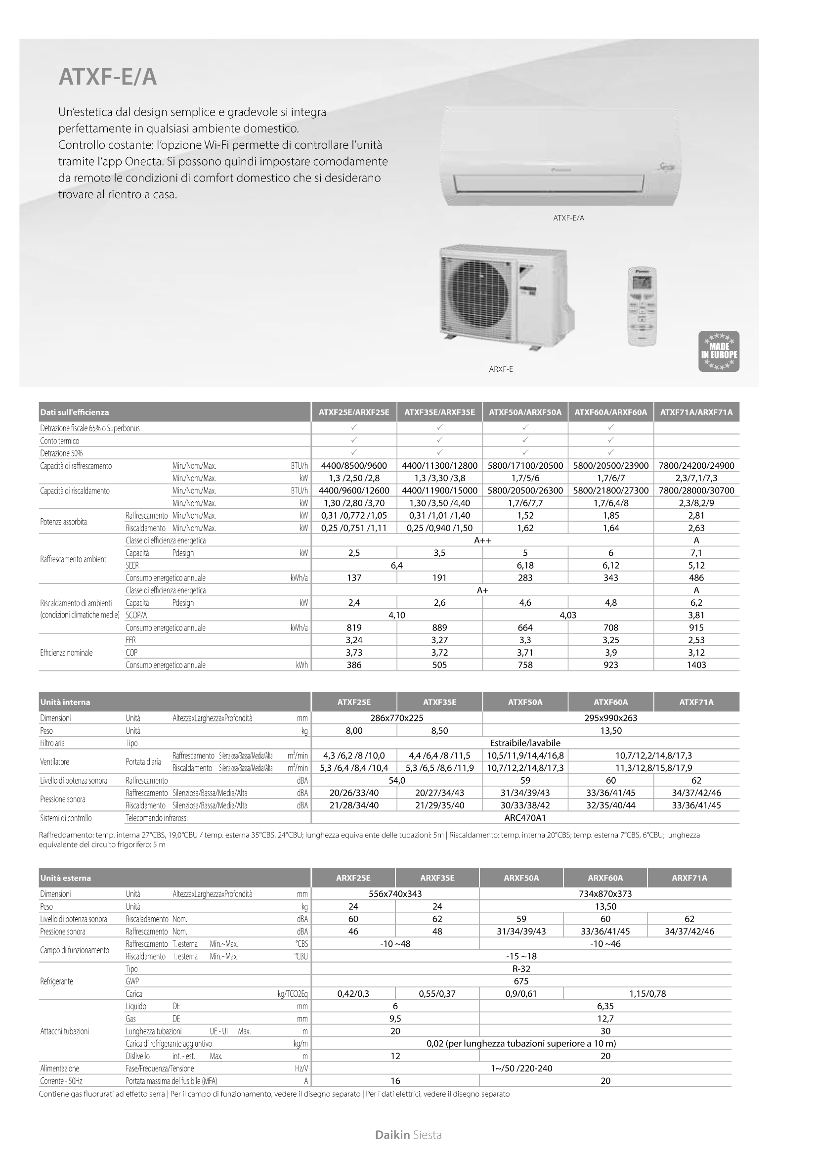 Atxf D › Il Pannello Frontale Piatto Ed Elegante Si Adatta A Qualsiasi Ambiente › Dimensioni Estremamente Ridotte › Classe Di Efficienza: Aa › Eco Mode Questa Funzione Riduce Il Consumo Energetico, Rendendola Disponibile Per Altre Applicazioni Che Richiedono Prestazioni Elevate. Questa Funzione Consente Inoltre Di Risparmiare Energia. › Risparmio Energetico In Modalità Standby: Riduce Il Consumo Energetico Di Ca. 80 In Modalità Standby › Unità Esterna Con Trattamento Anticorrosione Blue Fin › Controllo Tramite App Con Scheda Wlan Opzionale Capacità Di Raffreddamento Min. Nominativo Massimo. Kw 1,3 3,30 3,8 Potenza Termica Min. Nom. Massimo Kw 1,30 3,50 4,40 Telecomando A Infrarossi Arc470A1 Tipologia Filtro Aria Removibile Lavabile Consumo Energetico Annuo Kwh A 191 Classe Di Efficienza Energetica A Alimentazione Fase Frequenza Tensione Hz V 1~ 50 220 240 Corrente 50 Hz Portata Massima Fusibile Mfa A 16 Auto. Liquido Refrigerante Kg Tco2Eq 0,550 0,370