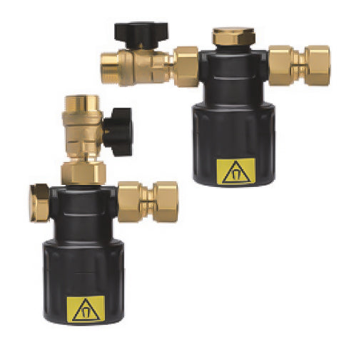 Defangatore magnetico per caldaie a condensazione, attacchi filettati ISO 228-G 3/4” con valvola e raccordo. Nero