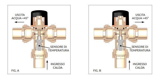 Deviatore termostatico per impianti solari. Attacchi a bocchettone filettati maschio, pressione massima d’esercizio 10 bar, temperatura massima d’esercizio 100°C. Deviazione della temperatura a 45°C.