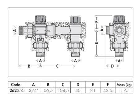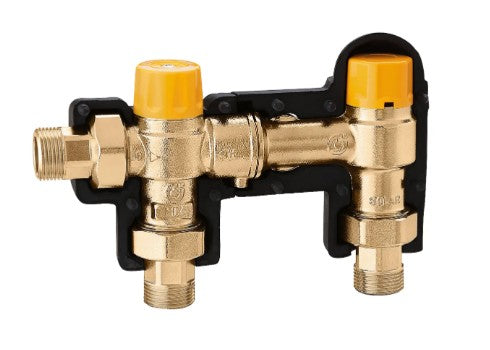 Kit di collegamento bollitore solare con caldaia, con integrazione termica. Completo di: - miscelatore termostatico antiscottatura regolabile con manopola, per impianti solari; - valvole di ritegno in ingresso; - valvola deviatrice termostatica; - dispositivo di controllo termostatico; - copertura protettiva a guscio preformata. Prestazioni a norma NF 079 doc. 8, EN 15092, EN 1111, EN 1287. Attacco: G 3/4" A (ISO 228-1) M. Pressione massima di esercizio: 10 bar. Campo di temperatura del fluido: 2–100 °C. Campo di regolazione della temperatura: 35–55 °C. Taratura valvola deviatrice: 45 °C. Materiale: ottone antidezincificazione DR.