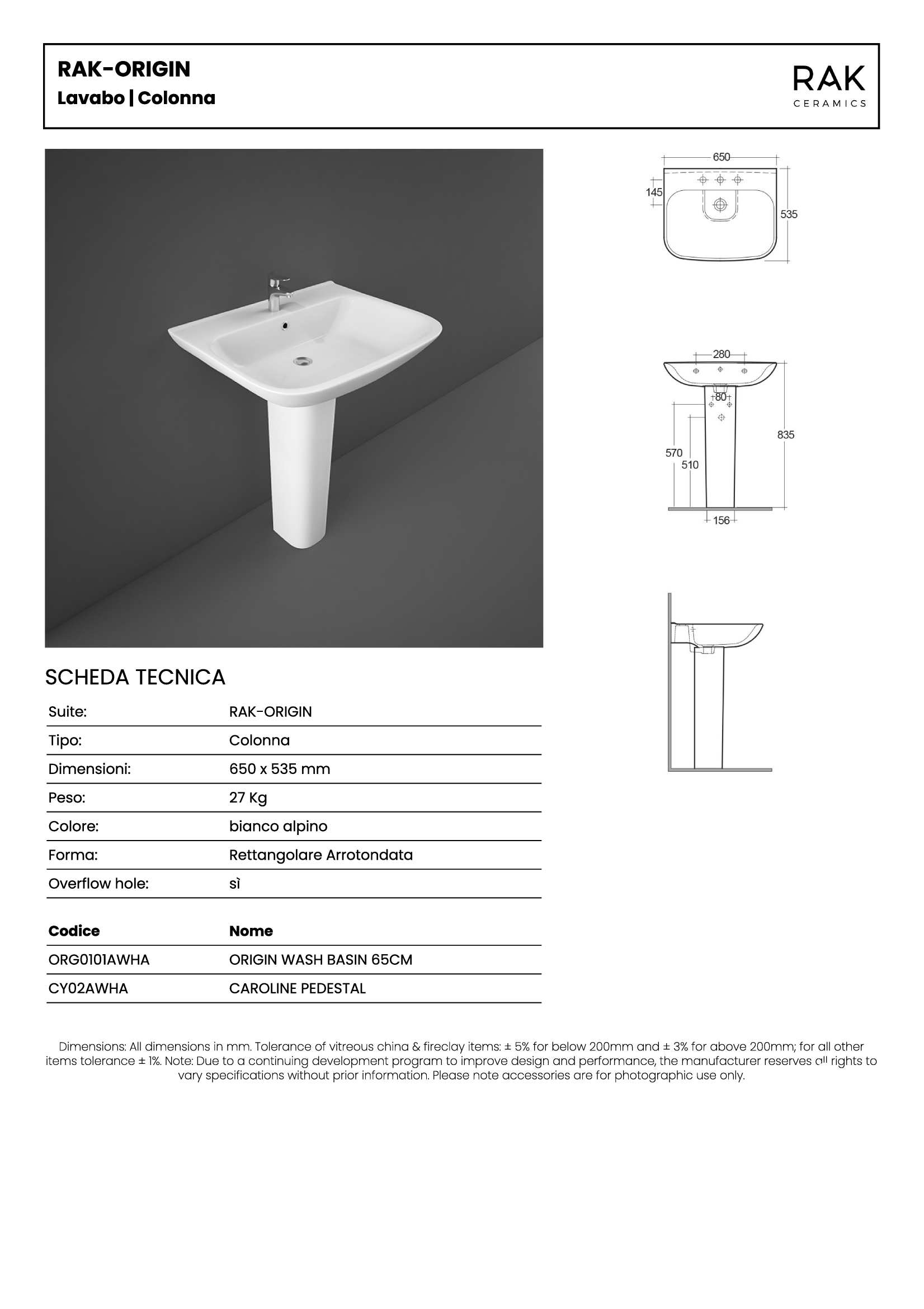 LAVABO IN CERAMICA DA 65 CM RAK SERIE ORIGIN