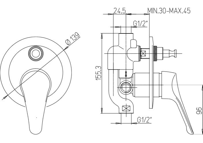 Miscelatore da incasso per doccia con Deviatore a due vie Argo serie Derby con cartuccia a dischi ceramici ø 40 – bassa.
