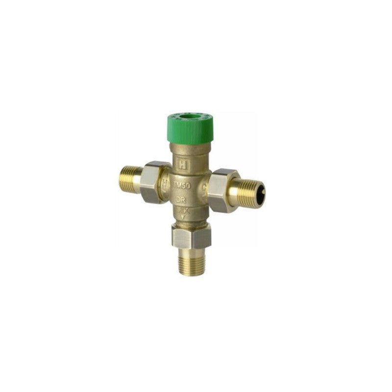 Valvola miscelatrice termostatica 1/2" con bocchettoni - Honeywell - TM50 - 30°/60° - I miscelatori termostatici TM50 provvedono al controllo della temperatura dell'acqua e sono impiegati per: il controllo centralizzato di unità di distribuzione acqua calda o per controllo localizzato nei pressi dei punti di utilizzo. Oppure per impieghi con unità ad acqua calda riscaldata con pannelli solari con doppia fonte di energia. In sistemi di riscaldamento con pannelli a pavimento o per limitare le temperature di ritorno alla caldaia. Nei sistemi con acqua calda sanitaria deve essere installato anche l'accessorio KB191 con funzione di ammortizzatore idraulico e valvola di non ritorno per impedire la circolazione di acqua fredda.