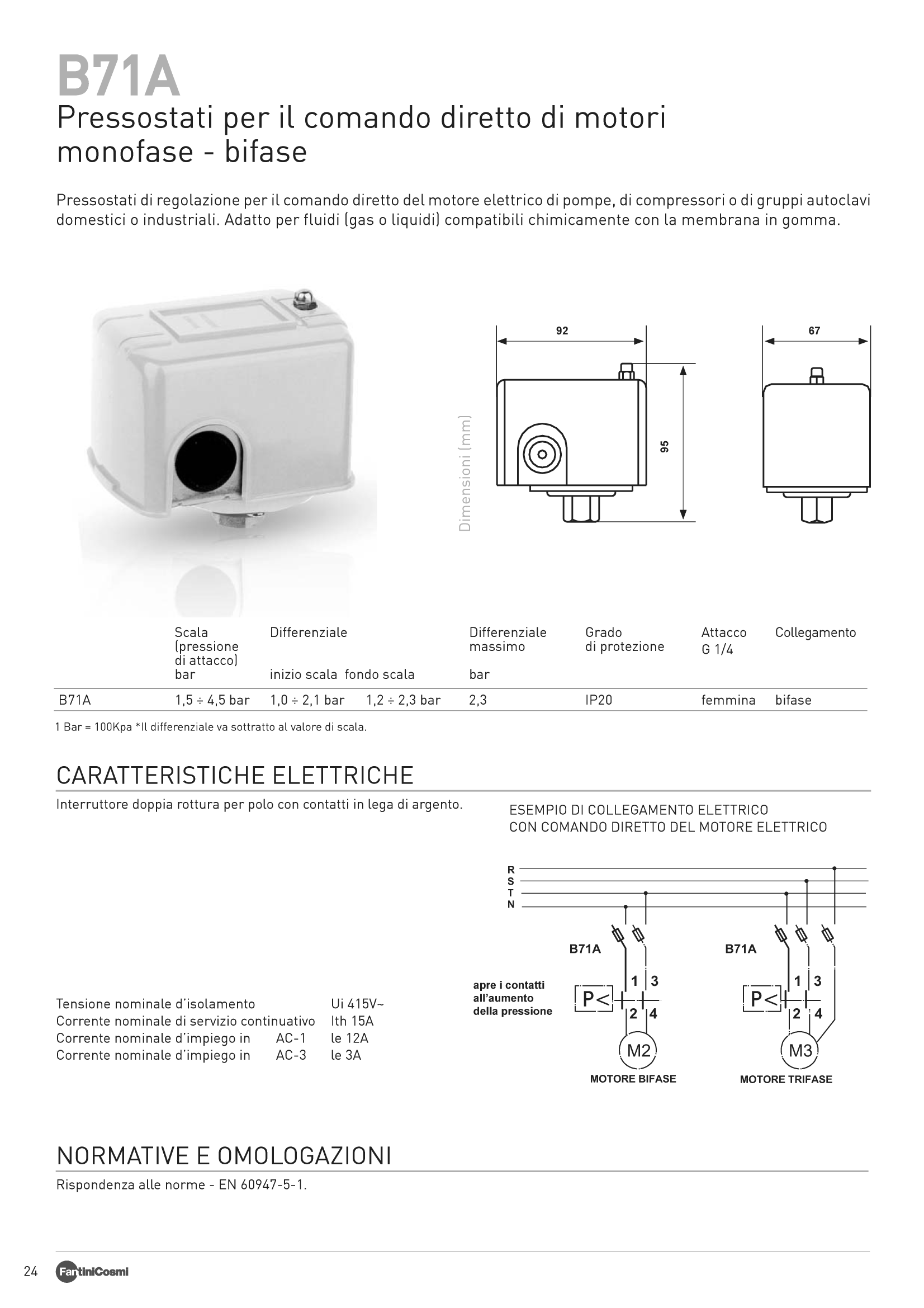 Pressostato per il Comando Diretto di Motori Monofase, BIFASE 230 V 1,5÷4,5 bar Fantini