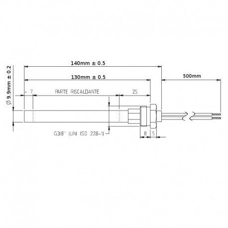 Esecuzione con raccordo filettato 3/8" GAS, diametro 9,9mm, lunghezza totale 140mm, lunghezza sottobattuta 130mm, 270Watt.