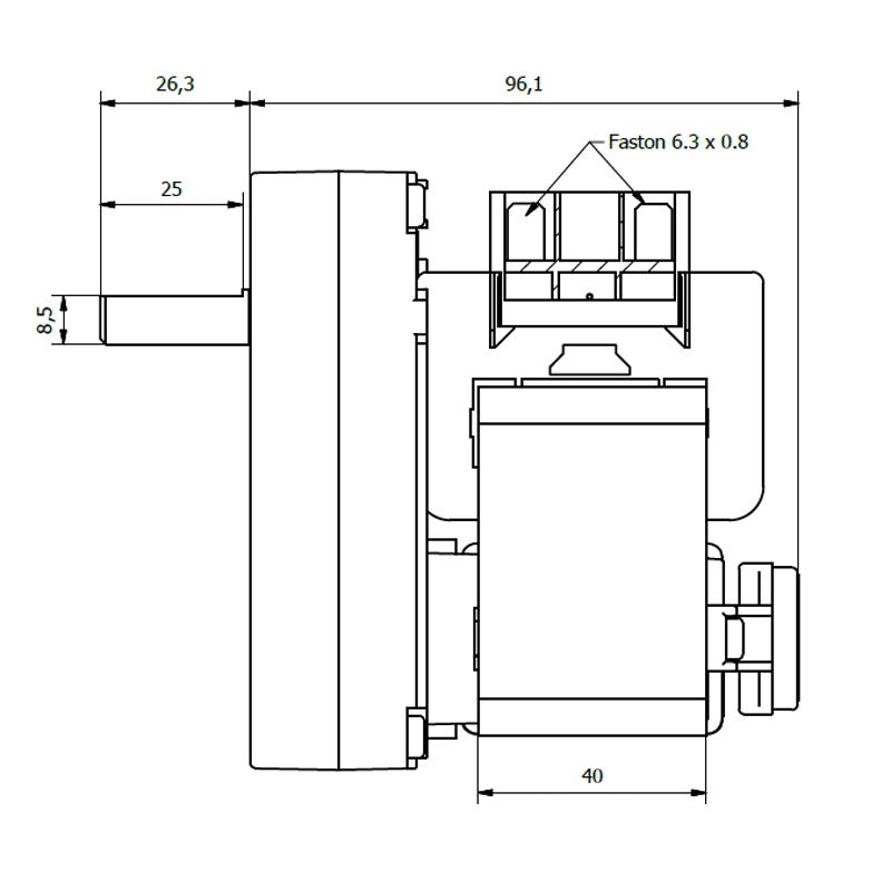 Serie 917, coppia nominale 25Nm, assorbimento 47Watt, velocità 5rpm, rotazione oraria, diametro albero 9,5mm, pacco lamellare da 40mm, alimentazione 220 V AC - 50/60Hz.