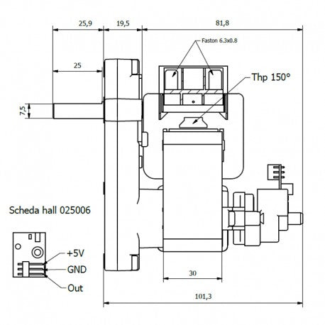 Serie 911, coppia nominale 30Nm, assorbimento 25Watt, velocità 1,5rpm, rotazione oraria, diametro albero 8,5mm, pacco lamellare da 30mm, alimentazione 220 V AC - 50/60Hz.