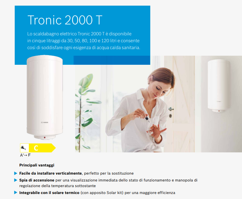Scaldabagno elettrico Bosch Tronic 2000T da 50 litri per installazione verticale consigliato per l'installazione in un'abitazione di 1 persona. Ha il controllo della temperatura esterna con una manopola rotante. Misure: 45,5 x 56,1 x 45,5 cm (larghezza x altezza x profondità).