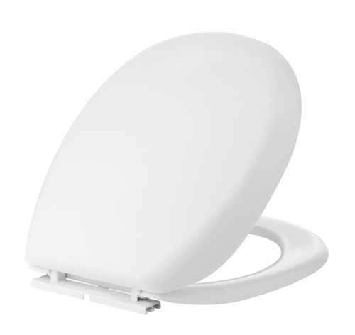 Sedile WC universale in resina infrangibile gr. 1200, modello K2 EVO avvolgente, con cerniere uniblock, colore bianco