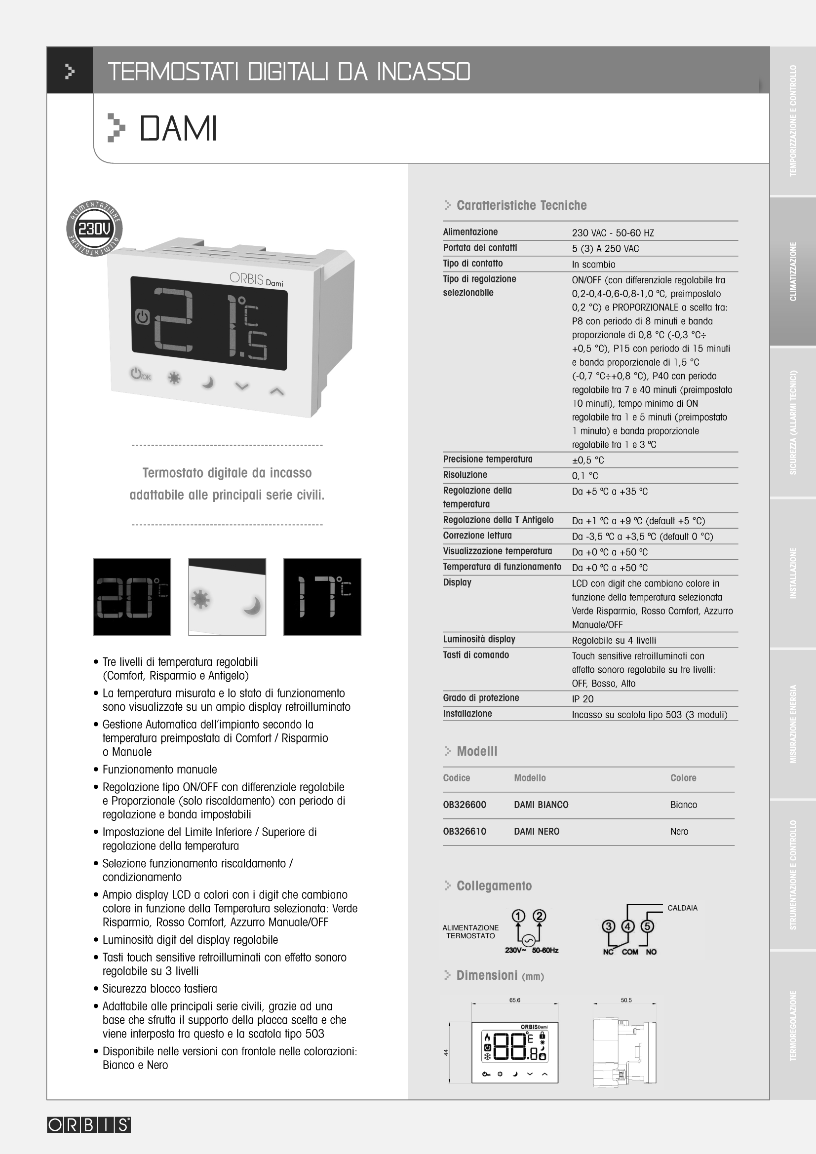 Il Termostato DAMI è un dispositivo digitale studiato per la gestione della temperatura in ambito domestico sia nella stagione invernale (riscaldamento) che in quella estiva (condizionamento), permettendo di assegnare due distinte temperature Comfort e Risparmio. Per il controllo delle diverse tipologie di impianto di riscaldamento il dispositivo dispone di due tipi di regolazione a scelta: ON/OFF e Proporzionale.