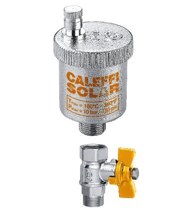 Valvola automatica di sfogo aria per impianti solari. Completa di: - valvola automatica di sfogo aria per impianti solari; - rubinetto d’intercettazione completo di guarnizione. Attacco: G 3/8" A (ISO 228-1) M. Pressione massima di esercizio: 10 bar. Pressione massima scarico aria: 5 bar. Campo di temperatura del fluido: -30–180 °C. Finitura: nichelata. Massima percentuale di glicole: 50 %. Fluido di impiego: acqua, soluzioni glicolate. Materiale: ottone.