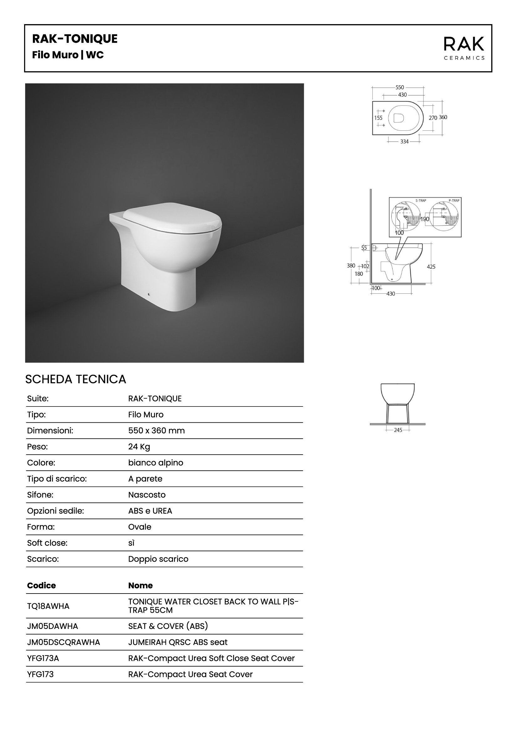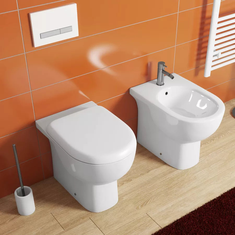 Vaso Filo muro della collezione Tonique di Rak Ceramics. Il wc ha un design semplice, realizzato con materiali di prima scelta che garantiscono una durata nel corso degli anni evitando ingiallimenti e crepe nella ceramica.