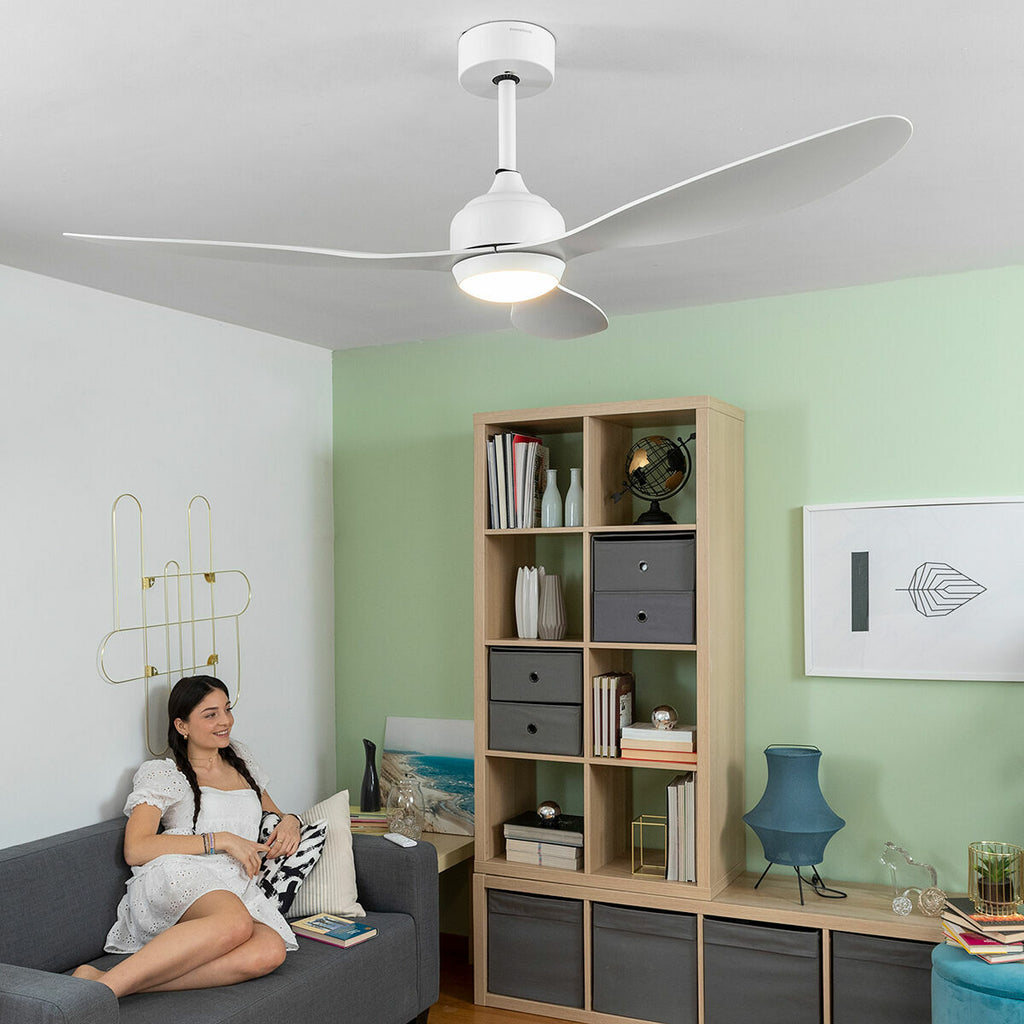 Un discreto e silenzioso ventilatore da soffitto con lampada che dispone di modalità estate-inverno-brezza e luce fredda-calda-neutra. Ideale per ventilare ambienti tra 15 e 20 m² circa.
